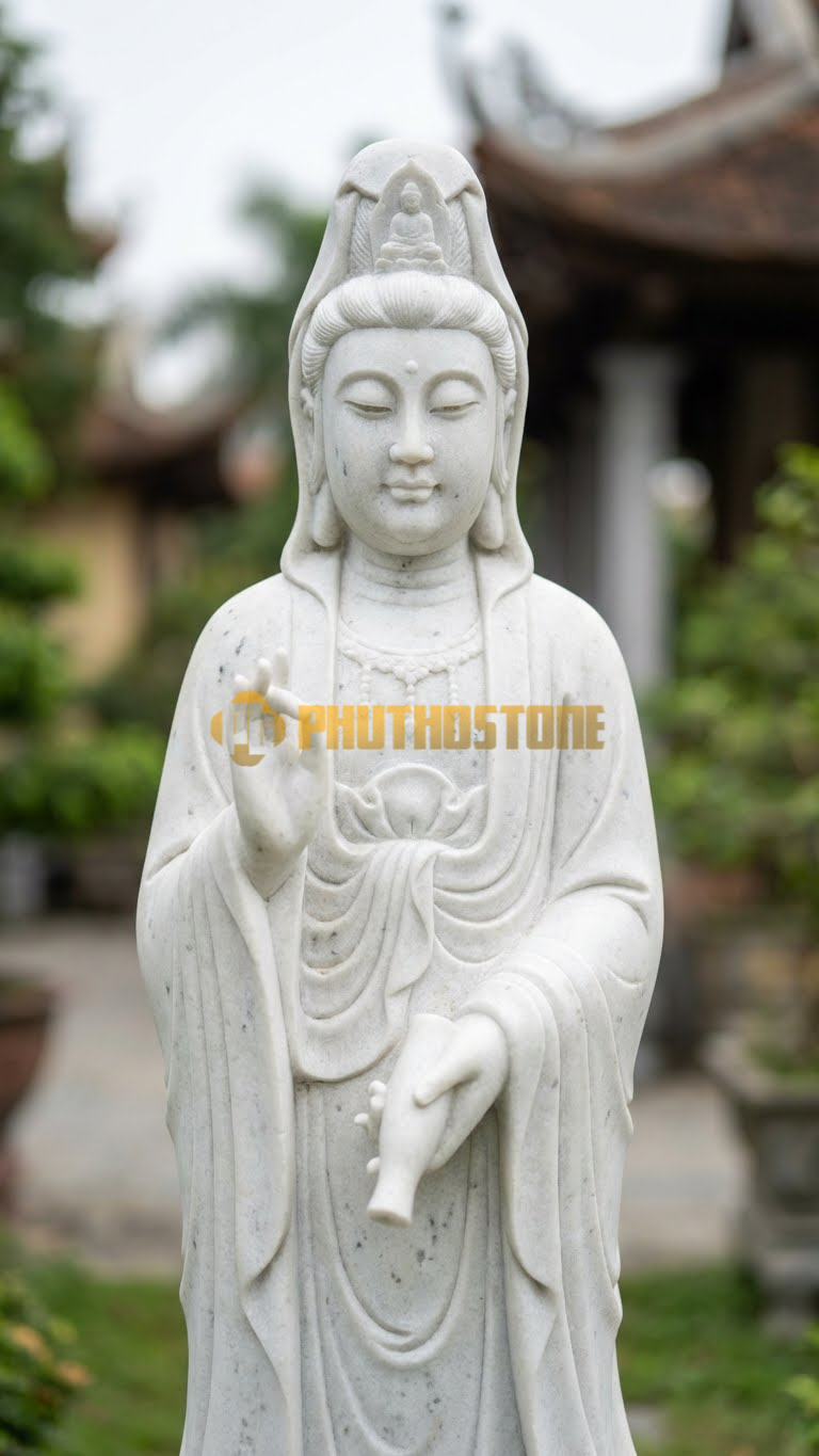 Trong quan niệm Phật giáo, Bạch Y Quan Âm (hay còn gọi là Bạch Y Đại Sĩ) là một trong những hóa thân phổ biến và gần gũi nhất của Bồ Tát Quán Thế Âm. Màu trắng của y phục không đơn thuần là một màu sắc, mà nó biểu trưng cho sự thanh tịnh tuyệt đối, tâm bồ đề không vướng bụi trần. Khi tôi tư vấn cho khách hàng tại Phú Thọ Stone, tôi thường giải thích rằng việc thỉnh một bức tượng đá trắng về nhà không chỉ để trang trí, mà là để nhắc nhở bản thân giữ gìn một lối sống trong sạch, hướng thiện.