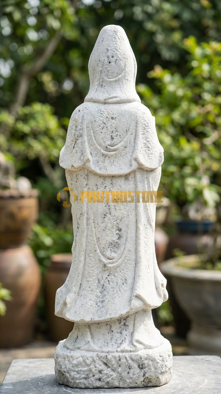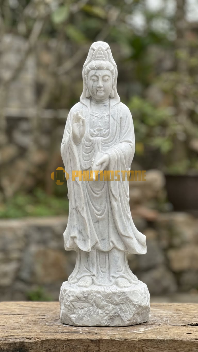 Màu trắng trong văn hóa tâm linh Á Đông luôn gắn liền với sự khởi đầu mới và sự tinh khôi. Đối với tượng Bạch Y Quan Âm, sắc trắng tượng trưng cho trí tuệ bát nhã, thấu suốt mọi khổ đau của nhân gian để từ đó ra tay cứu độ. Trải nghiệm thực tế của tôi cho thấy, những bức tượng được làm từ đá trắng nguyên khối thường có năng lượng rất mạnh, giúp không gian thờ cúng trở nên trang trọng và thanh thoát hơn hẳn.