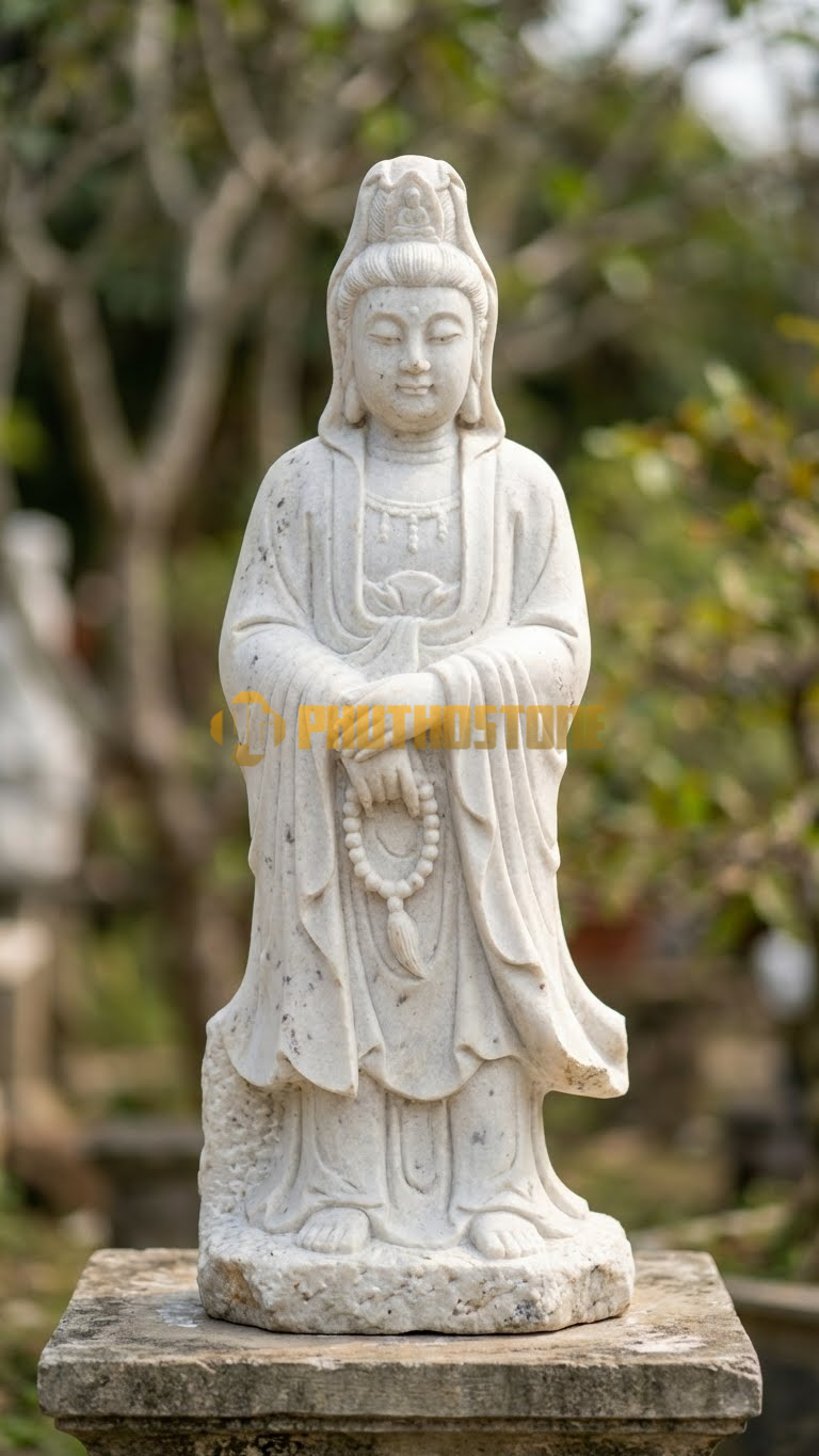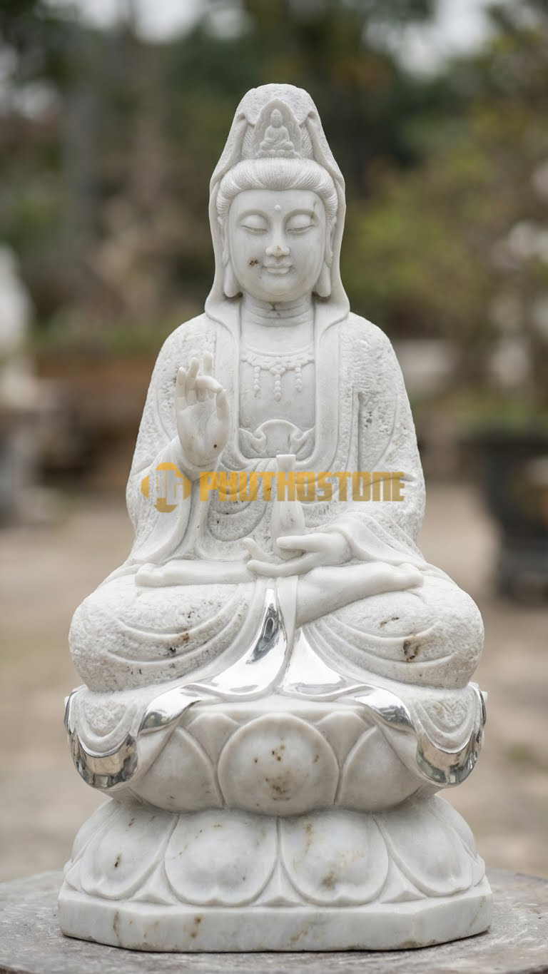 Đá cẩm thạch trắng (Marble) luôn là biểu tượng của sự xa hoa và tinh tế. Với những đường vân mây mờ ảo, tượng Bạch Y Quan Âm bằng đá cẩm thạch mang một vẻ đẹp mềm mại, uyển chuyển như đang bay bổng trong gió. Dòng đá này thường được các đại gia lựa chọn để thỉnh về đặt tại các phòng thờ tư gia cao cấp hoặc các khu lăng mộ đá trang trọng.