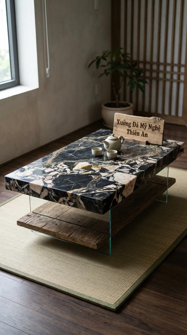 Bàn Trà Đa Tầng (Lồng ghép Đá & Gỗ) Đá Da Báo Dòng Chảy: Mặt đá uốn lượn nối liền với kệ gỗ thấp phía dưới 140cm x 60cm x 40cm