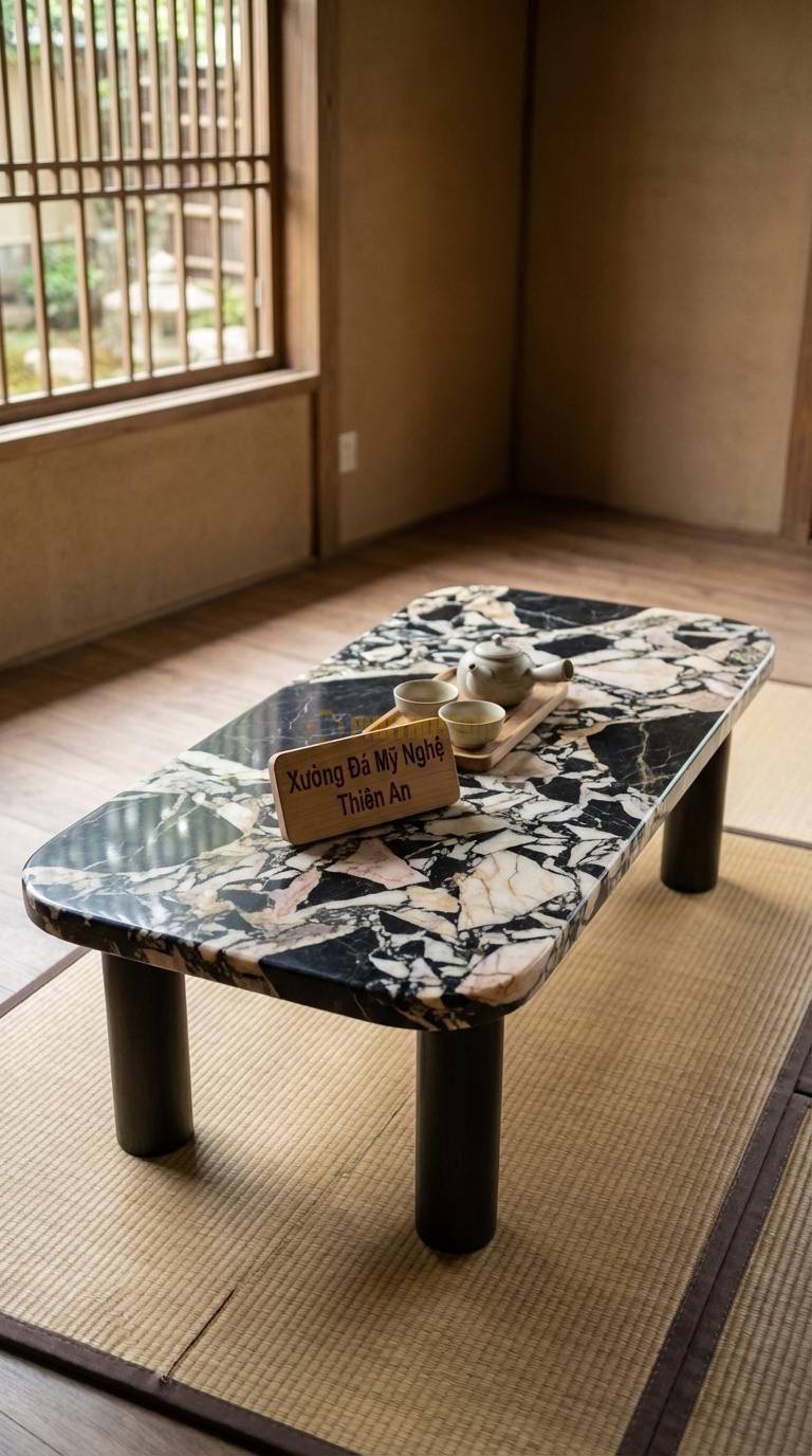 Nếu gia đình bạn có trẻ nhỏ hoặc thường xuyên tiếp khách, tôi sẽ khuyên bạn chọn đá Granite. Đây là loại đá có độ cứng chỉ sau kim cương trong thang đo tự nhiên. Granite có khả năng chống trầy xước và chịu nhiệt tuyệt vời. Những mẫu bàn trà Granite thường có vẻ đẹp khỏe khoắn với các hạt tinh thể lấp lánh dưới ánh đèn. Bạn có thể thoải mái đặt ấm trà nóng hay những vật dụng kim loại lên mặt bàn mà không lo hư hỏng. Sự bền bỉ của Granite giúp nó trở thành món đồ gia bảo, truyền đời trong gia đình mà không hề bị lỗi thời hay xuống cấp theo thời gian.