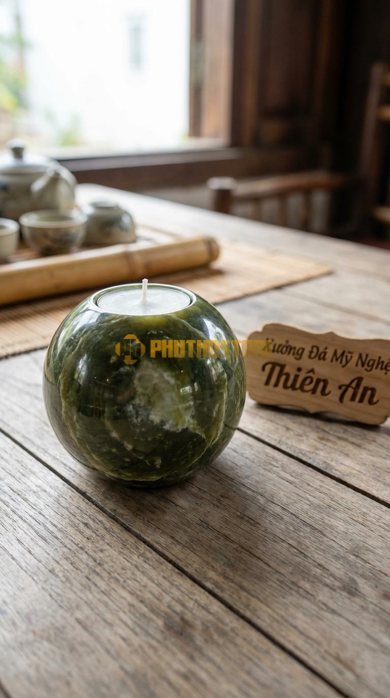 Nhiều khách hàng lo lắng hình cầu sẽ không đứng vững, nhưng thực tế chân nến của Phú Thọ Stone luôn được mài phẳng một diện tích nhỏ ở phần đáy (đế chìm). Điều này giúp quả cầu đứng cực kỳ vững chãi trên các bề mặt phẳng mà không hề làm mất đi vẻ đẹp tròn trịa tổng thể. Loan đảm bảo sản phẩm rất an toàn, ngay cả khi bạn đặt trên bàn kính hay kệ gỗ phẳng.