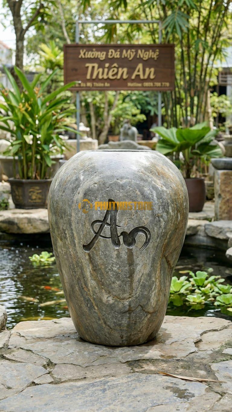 Lúc đó, tôi mỉm cười và dẫn bác đến góc trưng bày dòng sản phẩm tâm đắc nhất của mình: những chiếc chum đá cuội tự nhiên được chạm khắc thủ công tỉ mỉ. Tôi nói với bác rằng, đá không chỉ là vật liệu xây dựng, đá có linh hồn và hơi thở riêng của thời gian. Thay vì chọn những thứ bóng bẩy nhưng chóng phai, tại sao bác không chọn một biểu tượng của sự vĩnh cửu? Tôi giới thiệu cho bác mẫu Chum "Chữ An Thư Pháp". Nhìn những nét chữ uốn lượn mềm mại trên nền đá thô mộc, đôi mắt bác sáng rực lên. Bác nhận ra rằng, cái bác thiếu không phải là một món đồ trang trí đắt tiền, mà là một thông điệp về sự an nhiên được tạc vào đá.