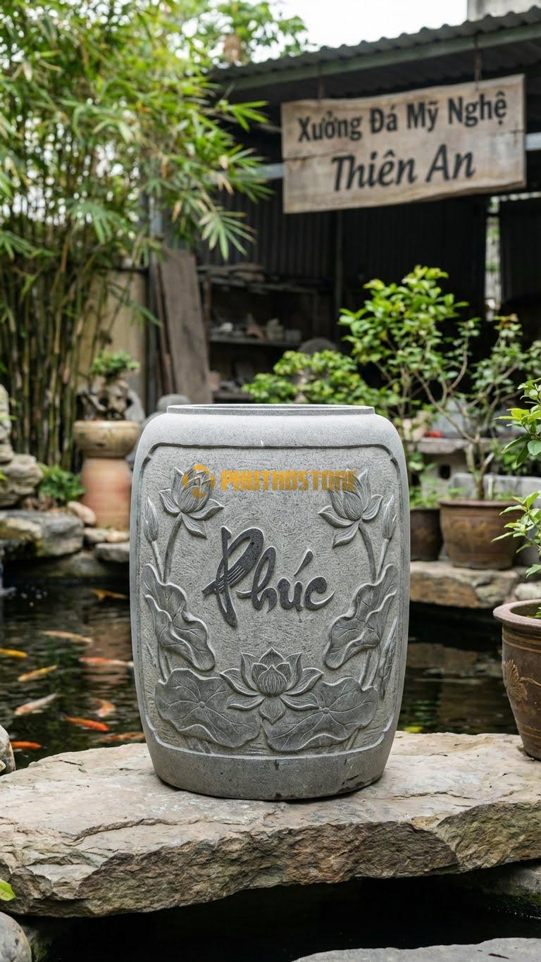 Trải nghiệm thực tế tại kho đá cho tôi thấy khách hàng ngày nay cực kỳ tinh tế. Họ không chỉ nhìn vào hình dáng bên ngoài mà còn để ý đến độ mịn của mặt đá, màu sắc tự nhiên và cách mà các vân đá chạy uốn lượn quanh thân chum. Mỗi loại đá như đá xanh rêu, đá xanh đen hay đá trắng đều mang lại một cảm sắc khác nhau. Với dòng Chum Hoa Sen và Chữ Phúc, tôi ưu tiên sử dụng đá xanh rêu vì màu sắc này gợi lên sự hoài cổ, rất phù hợp với hình tượng hoa sen thanh cao và chữ Phúc mang ý nghĩa may mắn, tốt lành cho gia đình.