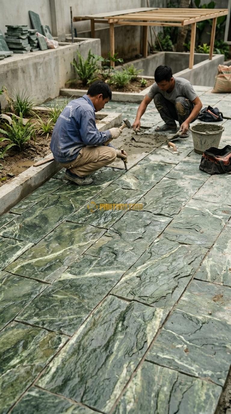 Ngoài ra, việc lựa chọn vật liệu gắn kết (keo dán đá hoặc vữa xi măng) cũng cần được chú trọng. Với các dòng đá tự nhiên có độ hút nước thấp, việc sử dụng keo chuyên dụng sẽ giúp tăng độ bám dính, tránh tình trạng đá bị "ộp" hay bong tróc sau này. Đừng vì tiết kiệm một chút chi phí vật tư phụ mà làm ảnh hưởng đến chất lượng của toàn bộ mảng sân đá đắt giá của bạn.