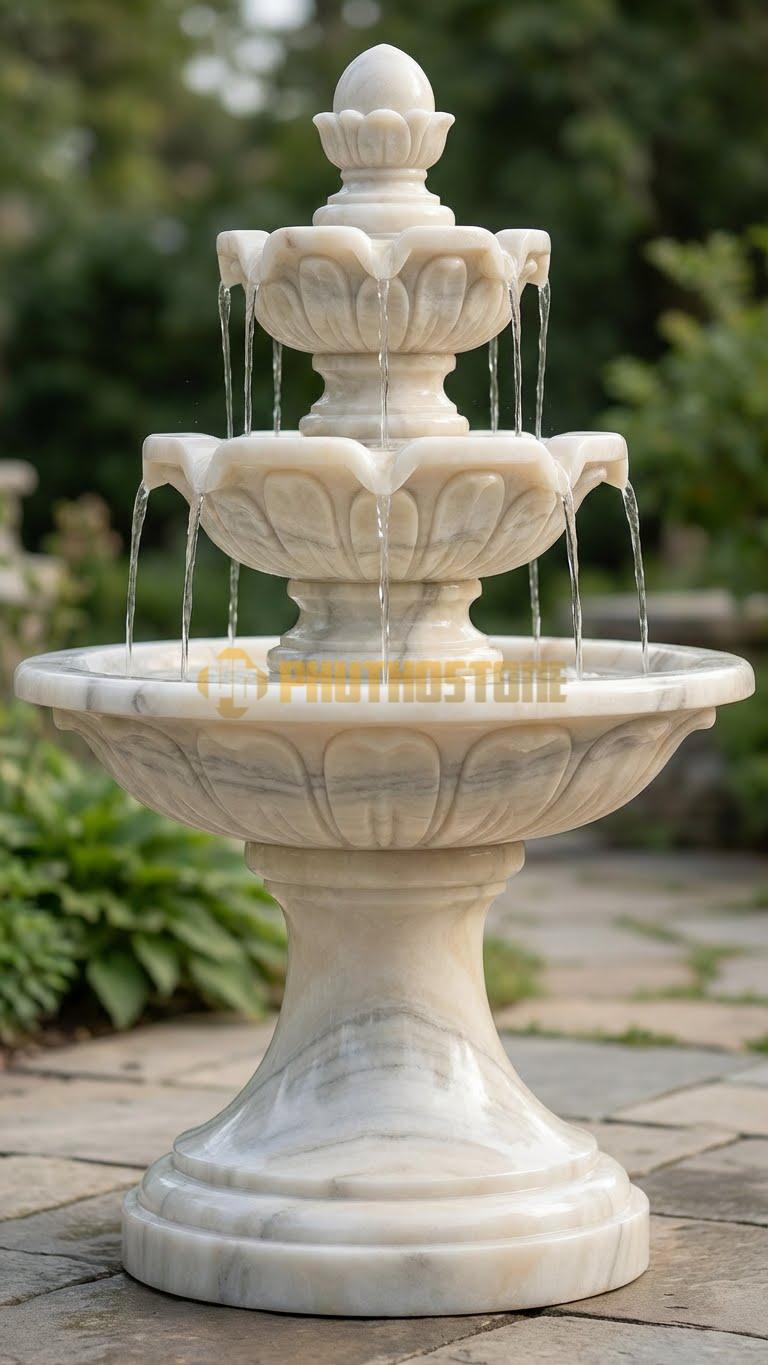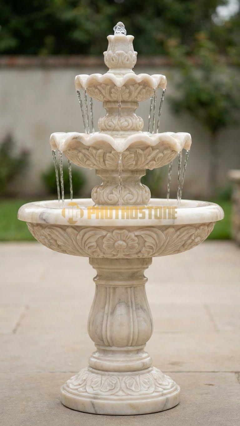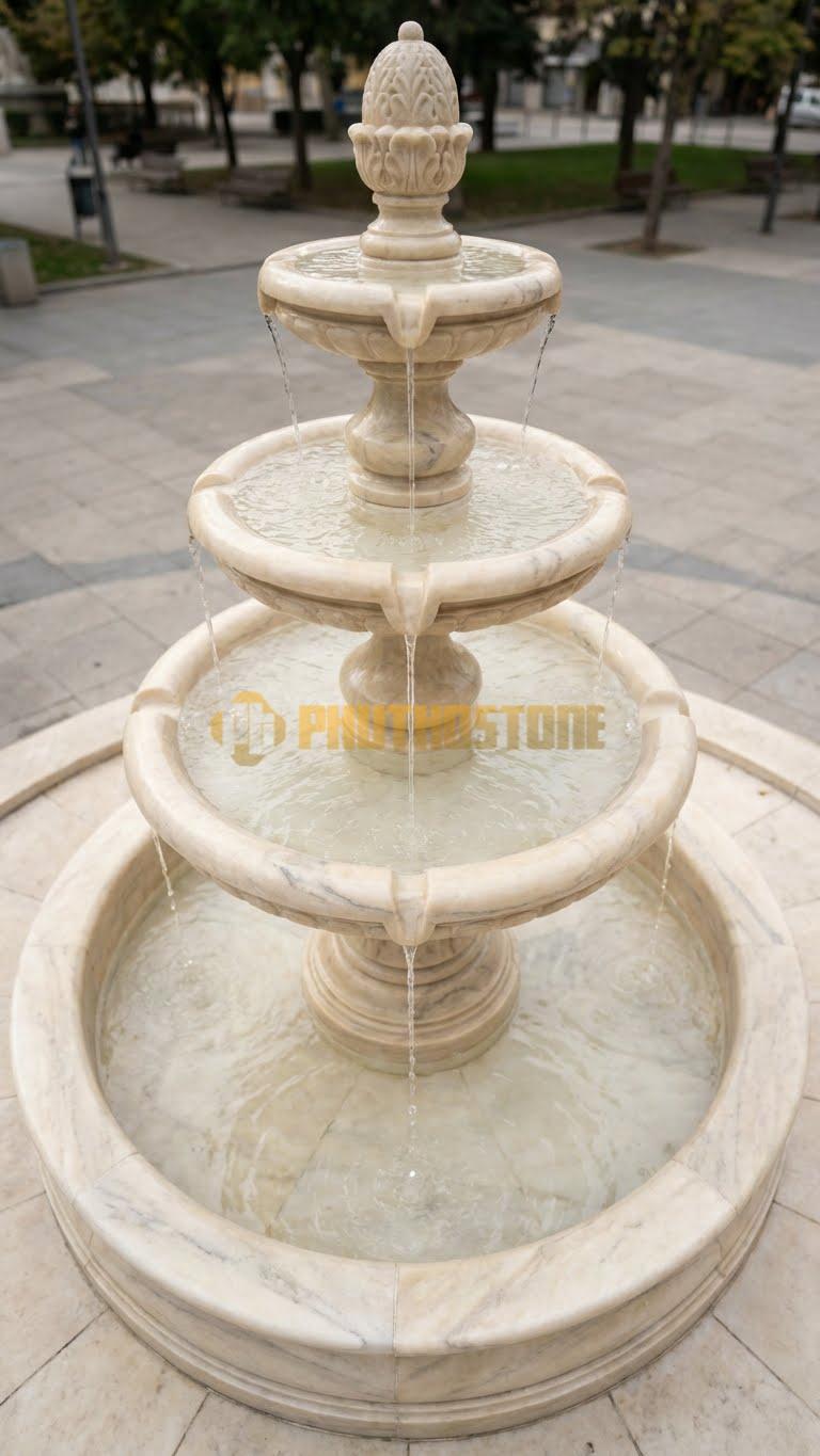 Tùy vào diện tích không gian và sở thích của gia chủ, tôi thường tư vấn các mẫu mã khác nhau. Phổ biến nhất vẫn là mẫu đài phun nước 3 tầng hoặc 5 tầng cổ điển. Với cấu trúc này, dòng nước sẽ tràn từ đỉnh cao nhất xuống các tầng dưới theo hình dạng bông hoa nở rộ, tạo nên hiệu ứng âm thanh róc rách rất bắt tai. Mẫu này cực kỳ phù hợp cho những sân vườn có không gian rộng hoặc đặt chính giữa vòng xuyến lối vào của các khu nghỉ dưỡng cao cấp.