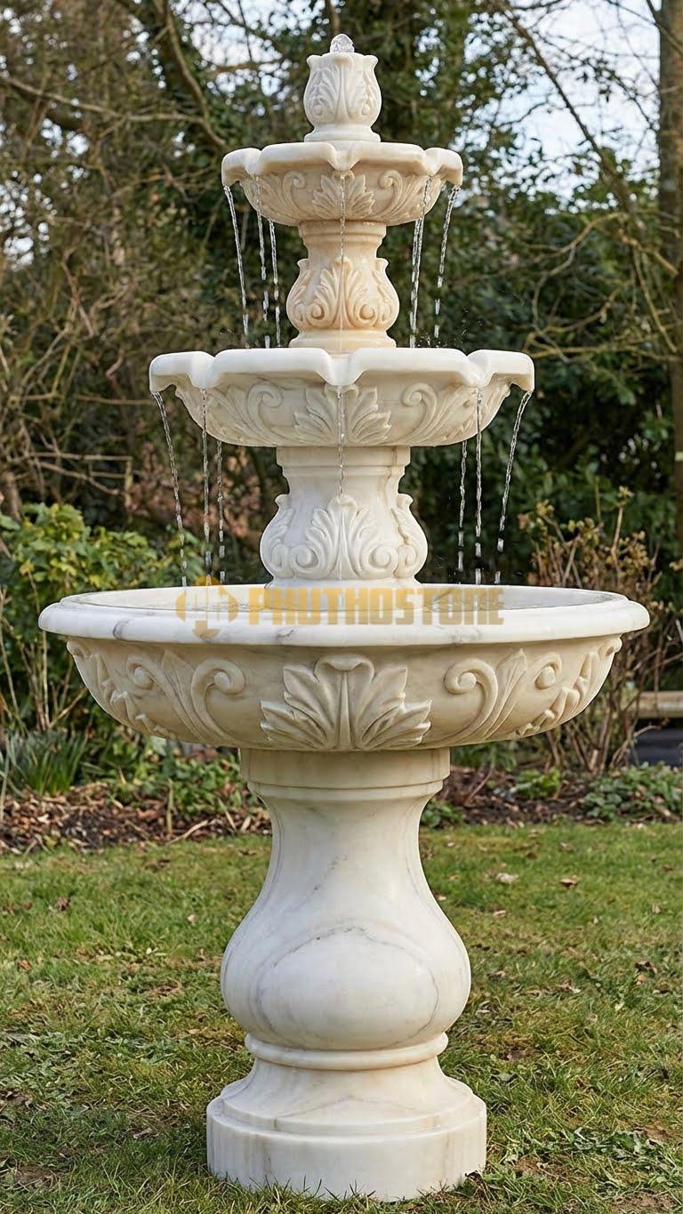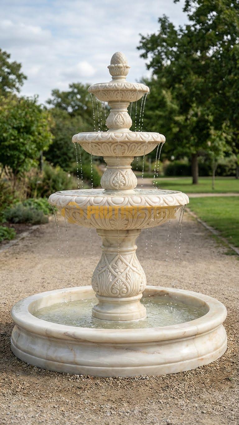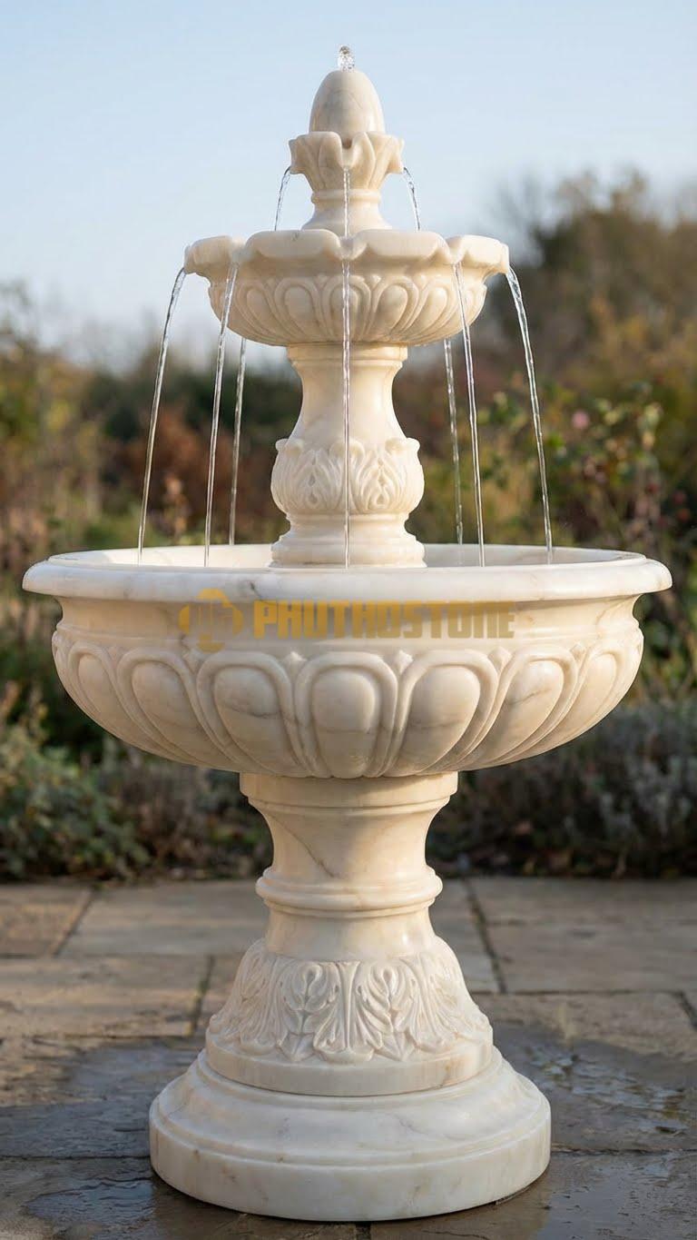 Tùy vào diện tích không gian và sở thích của gia chủ, tôi thường tư vấn các mẫu mã khác nhau. Phổ biến nhất vẫn là mẫu đài phun nước 3 tầng hoặc 5 tầng cổ điển. Với cấu trúc này, dòng nước sẽ tràn từ đỉnh cao nhất xuống các tầng dưới theo hình dạng bông hoa nở rộ, tạo nên hiệu ứng âm thanh róc rách rất bắt tai. Mẫu này cực kỳ phù hợp cho những sân vườn có không gian rộng hoặc đặt chính giữa vòng xuyến lối vào của các khu nghỉ dưỡng cao cấp.
