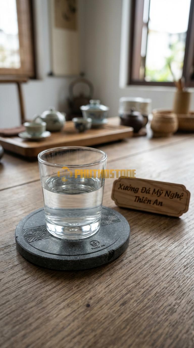 Đá tự nhiên, đặc biệt là các dòng đá Slate hay đá Granite, có độ bền cơ học cực cao. Khi tôi tư vấn cho khách, tôi luôn nhấn mạnh vào khả năng chịu nhiệt và không thấm nước của chúng. Một chiếc lót ly bằng đá sẽ không bao giờ bị biến dạng hay ẩm mốc dù tiếp xúc với nước đá lạnh từ ly rượu trong thời gian dài. Hơn nữa, trọng lượng của đá giúp chiếc lót ly nằm cố định trên bàn, không bị dính chặt vào đáy ly khi bạn nhấc lên – một lỗi rất khó chịu thường gặp ở lót ly nhựa hay giấy.