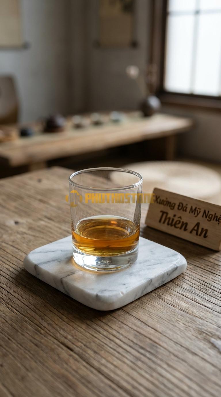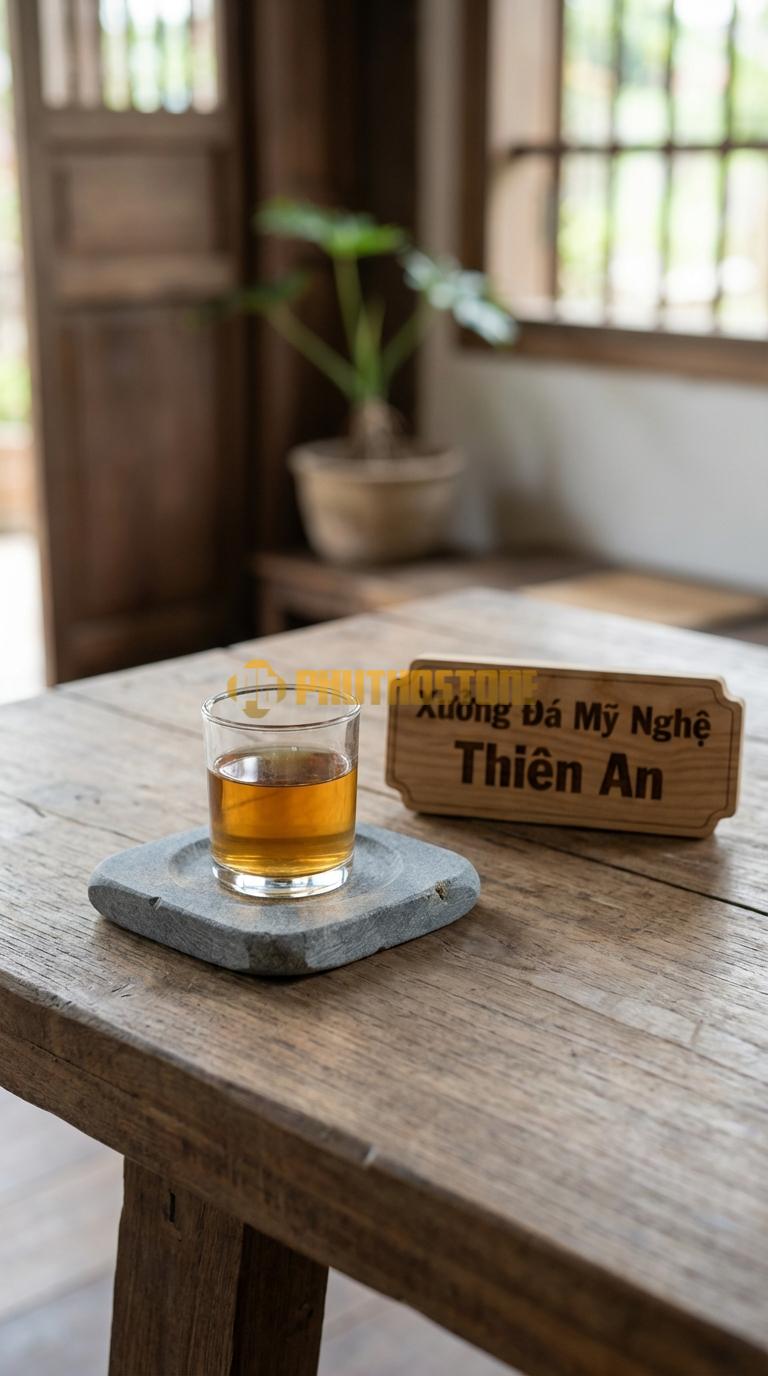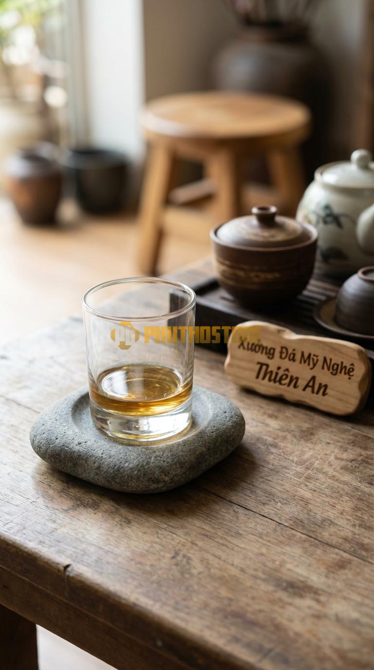 Tôi còn nhớ như in một buổi chiều cuối năm tại kho đá Phú Thọ Stone, khi trời đã bắt đầu bảng lảng sương và cái lạnh của vùng đất trung du len lỏi vào từng thớ đá. Một vị khách quen của tôi, anh Nam – một chủ doanh nghiệp yêu thích sưu tầm rượu ngoại và nội thất cao cấp – ghé thăm với vẻ mặt khá trăn trở. Anh kể rằng mình vừa đầu tư một bộ bàn gỗ gõ đỏ nguyên khối trị giá hàng trăm triệu đồng, nhưng sau một vài bữa tiệc tiếp khách, những vết ố từ đáy ly rượu vang và hơi nước ngưng tụ đã khiến mặt bàn xuất hiện những quầng thâm khó chịu. Dù đã dùng các loại lót ly bằng vải hay gỗ thông thường, nhưng chúng không đủ nặng để giữ chắc ly rượu, lại còn hay bị dính chặt vào đáy ly khi nhấc lên, gây ra sự bất tiện vô cùng.