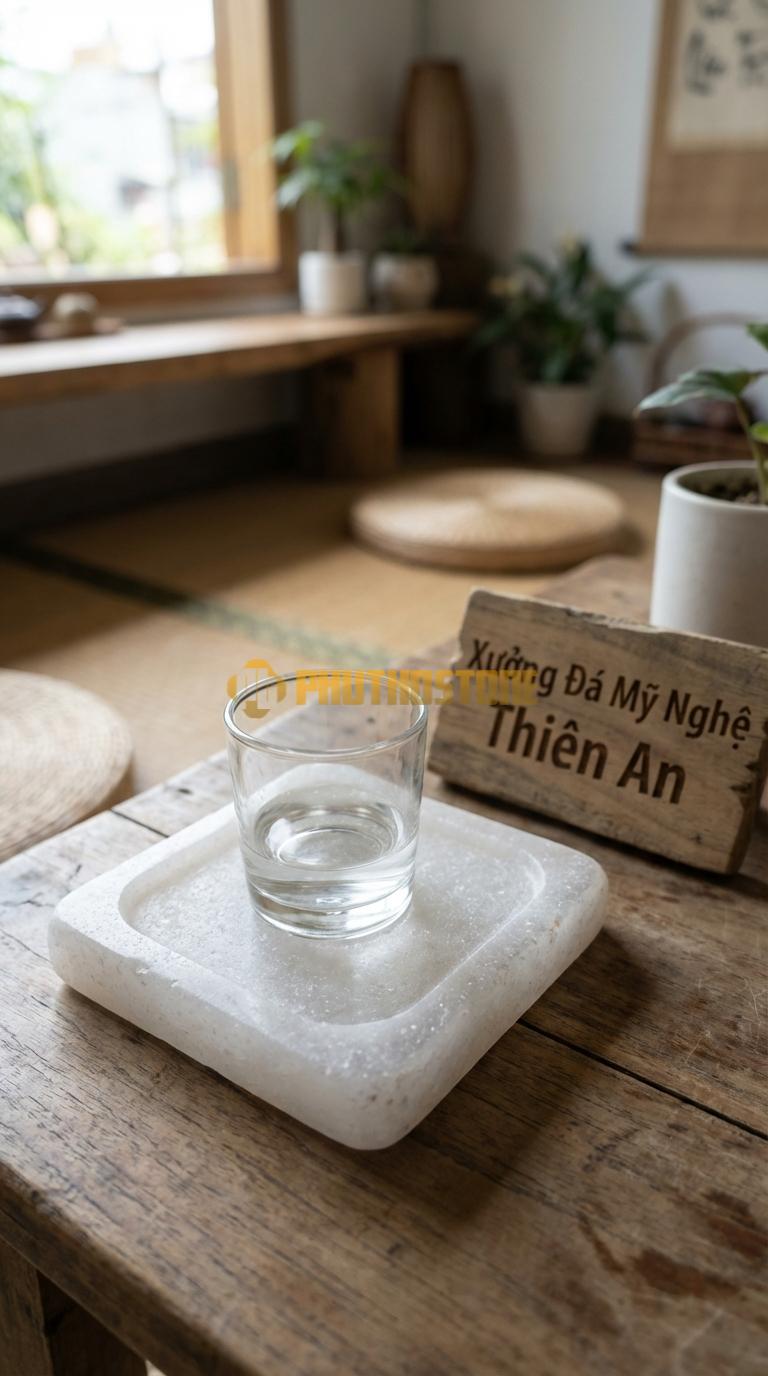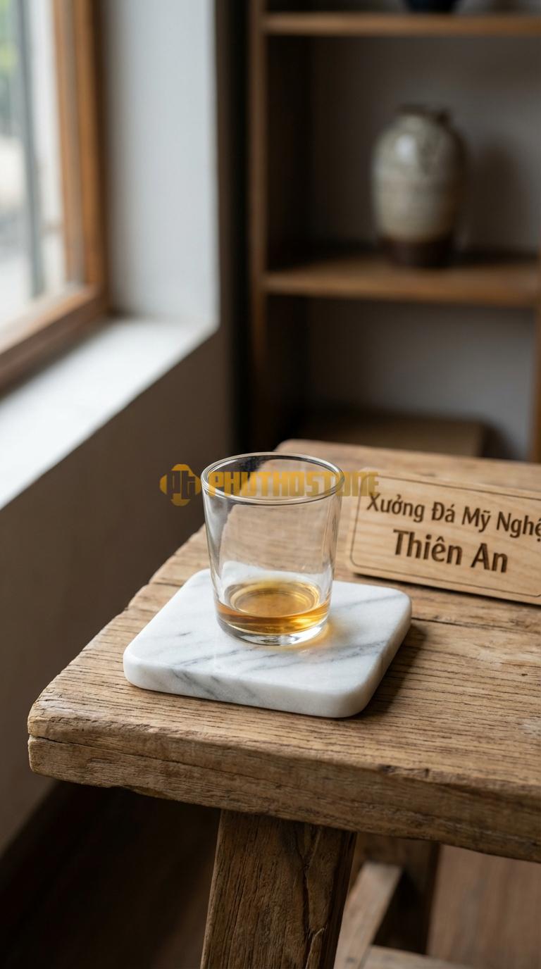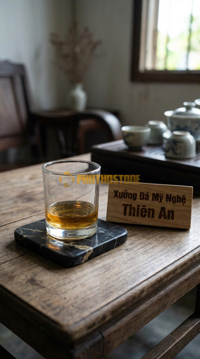 Tôi còn nhớ như in một buổi chiều cuối năm tại kho đá Phú Thọ Stone, khi trời đã bắt đầu bảng lảng sương và cái lạnh của vùng đất trung du len lỏi vào từng thớ đá. Một vị khách quen của tôi, anh Nam – một chủ doanh nghiệp yêu thích sưu tầm rượu ngoại và nội thất cao cấp – ghé thăm với vẻ mặt khá trăn trở. Anh kể rằng mình vừa đầu tư một bộ bàn gỗ gõ đỏ nguyên khối trị giá hàng trăm triệu đồng, nhưng sau một vài bữa tiệc tiếp khách, những vết ố từ đáy ly rượu vang và hơi nước ngưng tụ đã khiến mặt bàn xuất hiện những quầng thâm khó chịu. Dù đã dùng các loại lót ly bằng vải hay gỗ thông thường, nhưng chúng không đủ nặng để giữ chắc ly rượu, lại còn hay bị dính chặt vào đáy ly khi nhấc lên, gây ra sự bất tiện vô cùng.