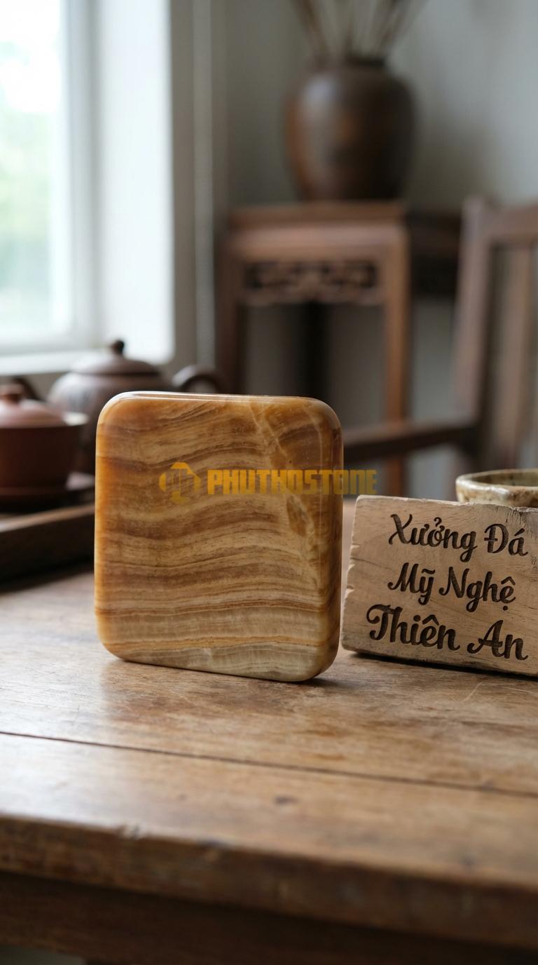 Điểm khác biệt lớn nhất mà tôi luôn nhấn mạnh với khách hàng chính là giá trị thẩm mỹ độc bản. Không có hai miếng đá tự nhiên nào hoàn toàn giống hệt nhau về đường vân. Mỗi chiếc đế lót ly là một tác phẩm hội họa của thiên nhiên với những đường vân uốn lượn, lúc thì mạnh mẽ như dòng thác, lúc lại dịu dàng như tơ lụa. Thiết kế vuông bo (vuông nhưng được mài tròn các góc) tạo ra một sự cân bằng hoàn hảo giữa sự cứng cáp của đá và nét mềm mại, tinh tế của nghệ thuật chế tác thủ công. Nó mang lại cảm giác an toàn, không sắc nhọn, rất phù hợp với những gia đình có trẻ nhỏ hoặc những không gian đòi hỏi sự chỉn chu cao độ.