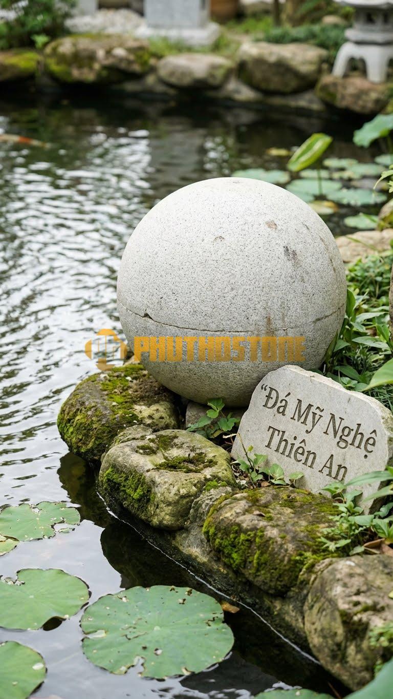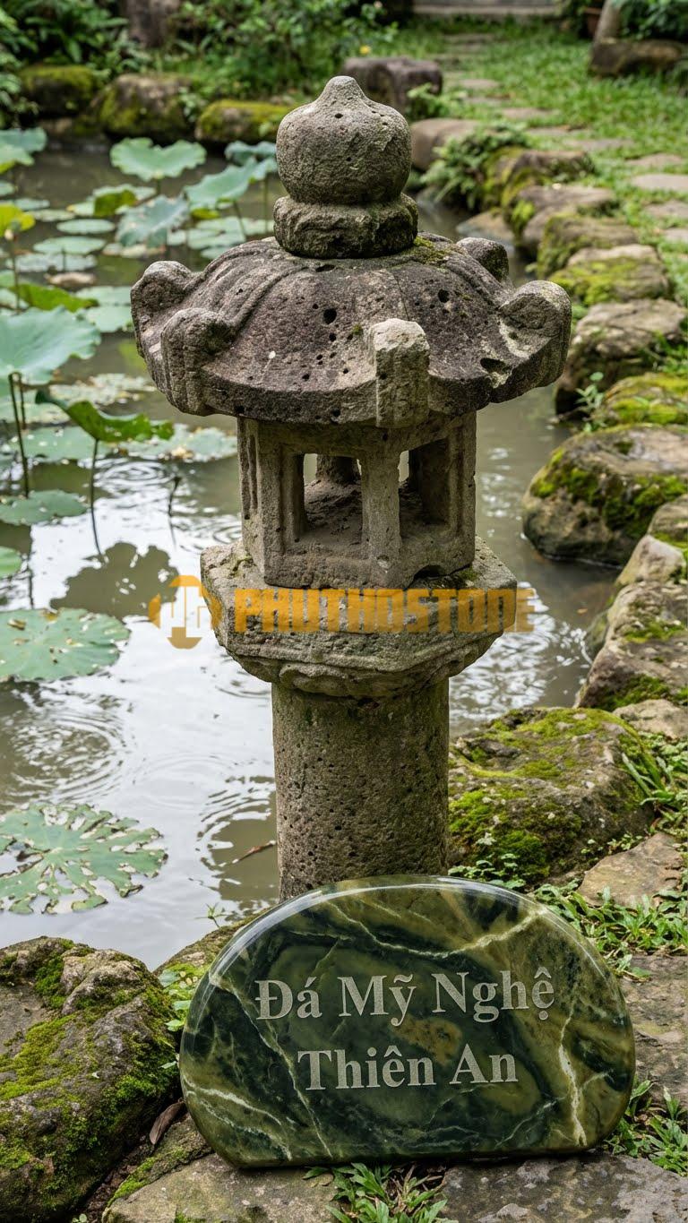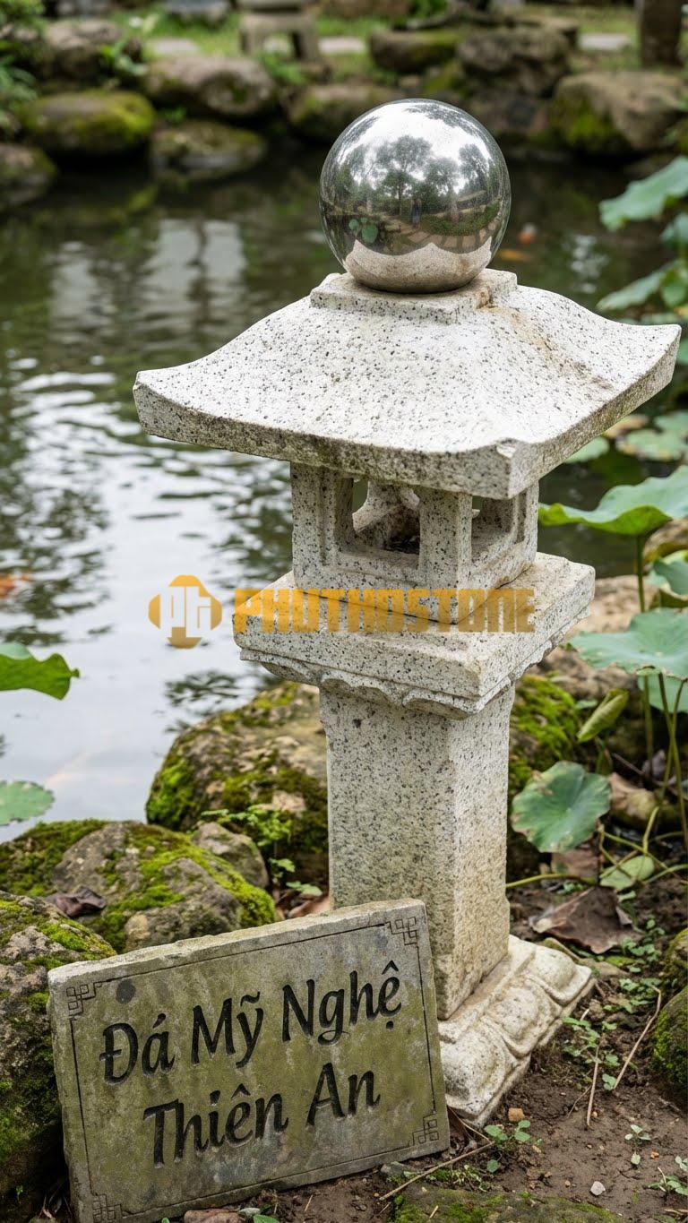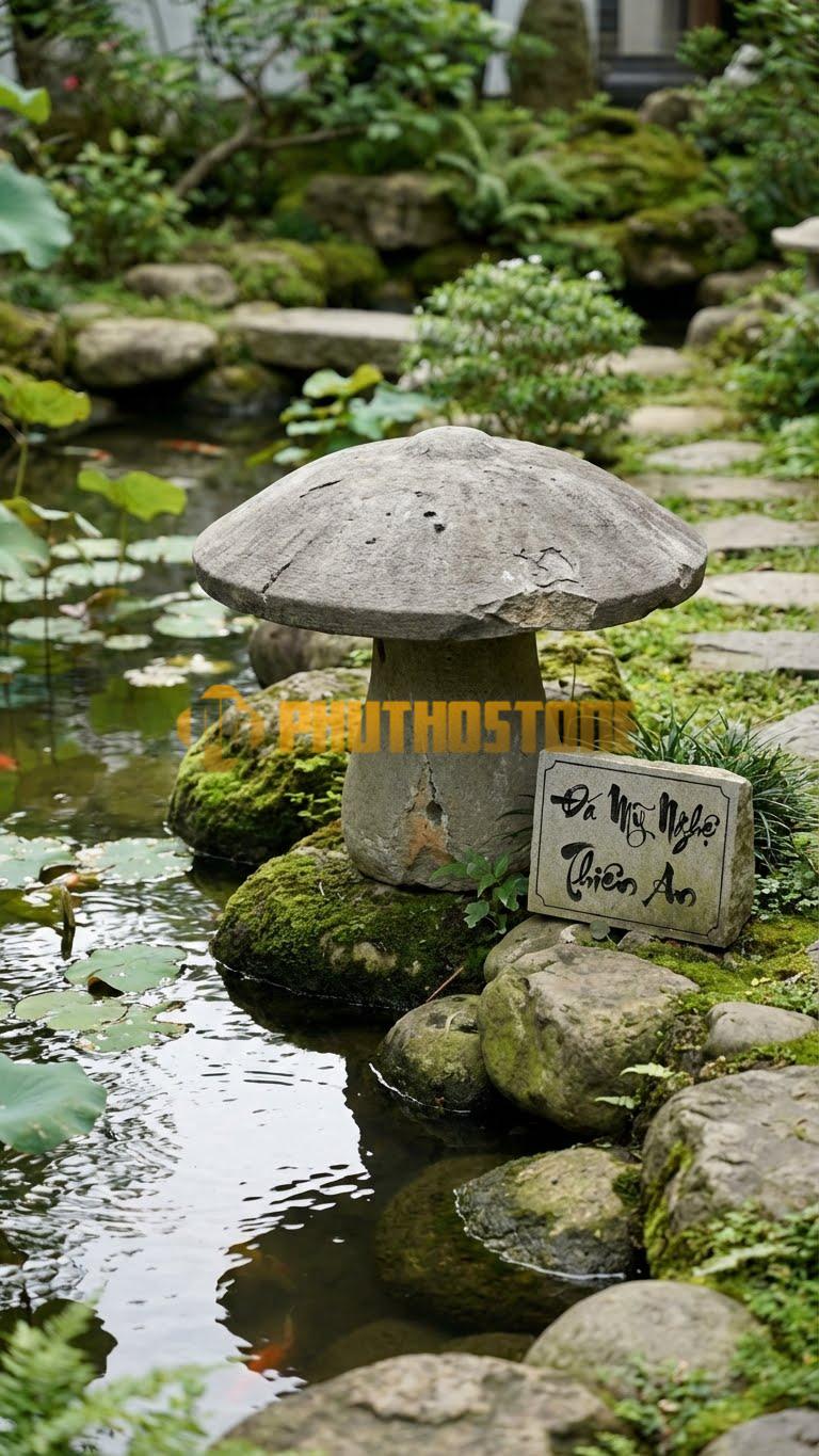 Đèn nấm đá đặc biệt phù hợp khi kết hợp với tiếng nước chảy róc rách. Đá và nước vốn là đôi bạn đồng hành tuyệt vời trong phong thủy. Một chiếc đèn nấm bằng đá xanh Thanh Hóa đặt bên cạnh một thác nước nhỏ sẽ tạo nên vẻ đẹp cổ điển, gợi nhớ về những ngôi chùa cổ hay những khu vườn hoàng gia. Nếu bạn muốn tăng thêm sự độc đáo, có thể cân nhắc kết hợp thêm một chiếc Đèn Cầu Tròn (Sphere) bên cạnh đèn nấm để tạo ra sự đa dạng về hình khối, giúp tiểu cảnh nước trở nên sinh động và có lớp lang hơn.