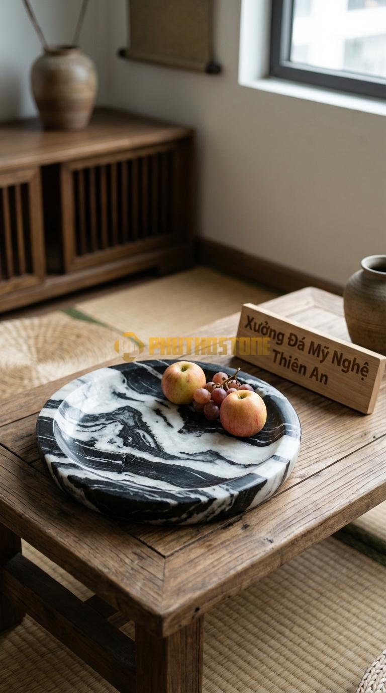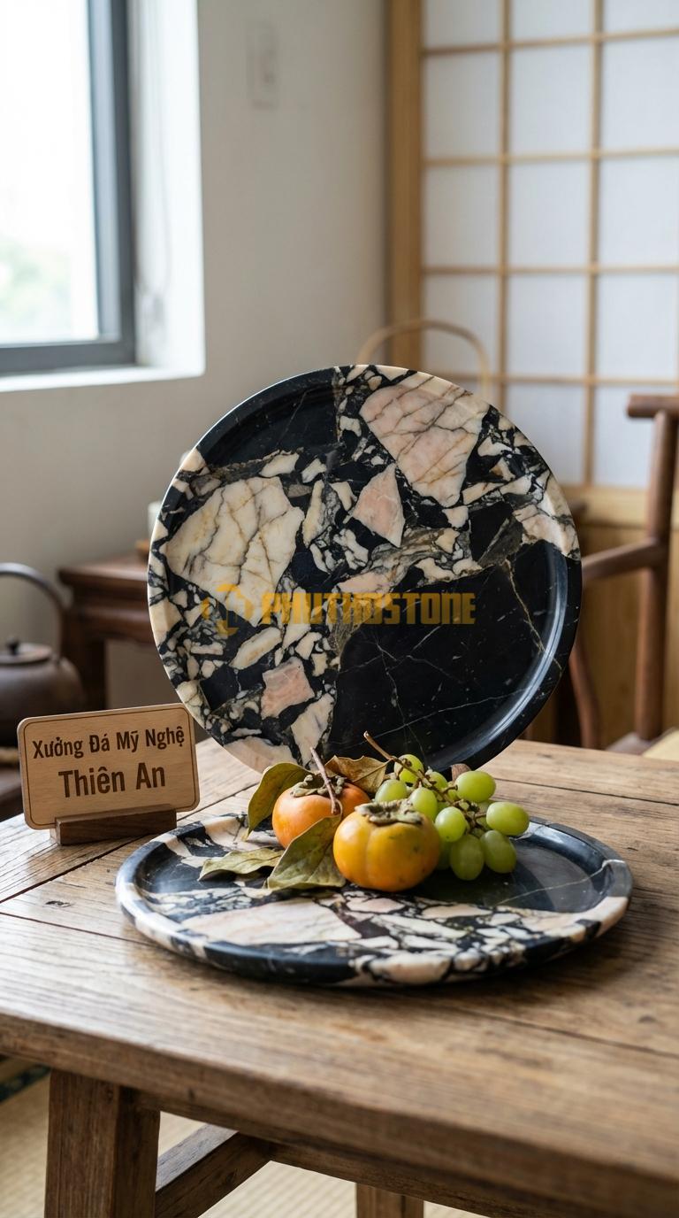 Nếu bạn cần một chiếc đĩa "nồi đồng cối đá" đúng nghĩa, hãy chọn Granite. Loại đá này cực kỳ cứng, chống thấm tuyệt vời và có bề mặt đen sâu thẳm. Những chiếc đĩa đá Granite tròn phẳng mang lại vẻ đẹp đẳng cấp, mạnh mẽ và rất sạch sẽ. Chúng rất phù hợp để bày biện những món đồ có màu sắc rực rỡ như hoa quả đỏ, cam để tạo sự tương phản thị giác ấn tượng. Tại Phú Thọ Stone, dòng đĩa này luôn nằm trong danh sách bán chạy nhất cho các văn phòng công ty hoặc phòng khách của các đấng mày râu vì sự tinh giản mà uy lực mà nó mang lại.