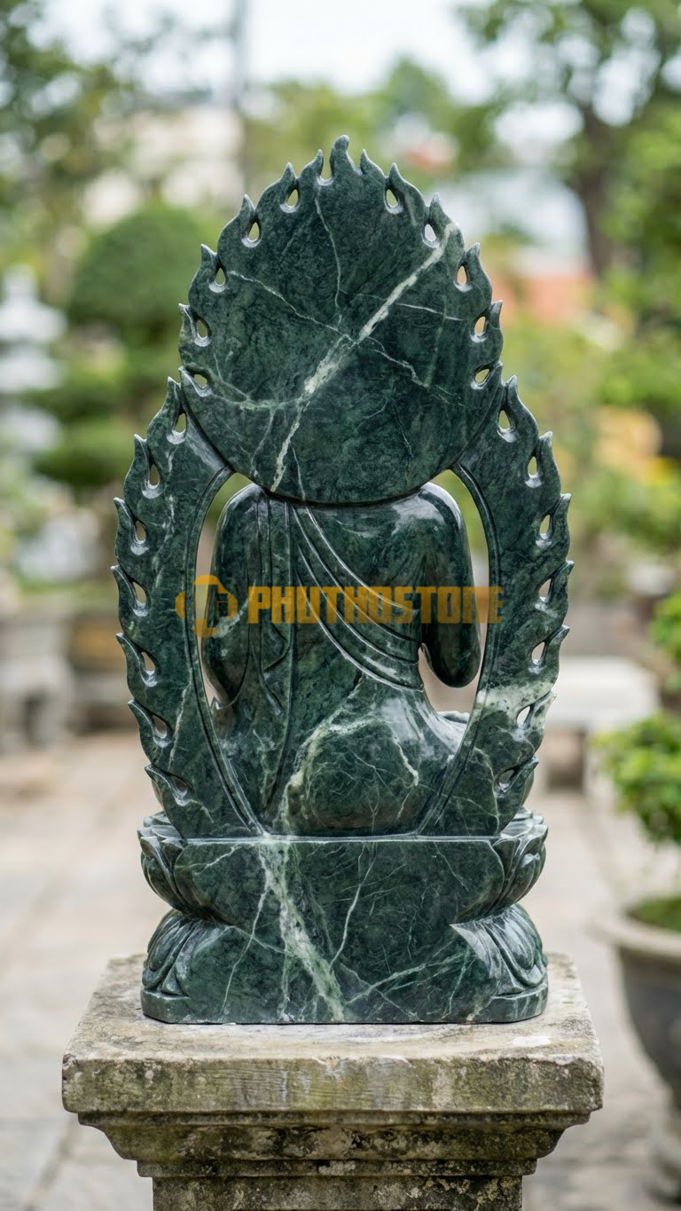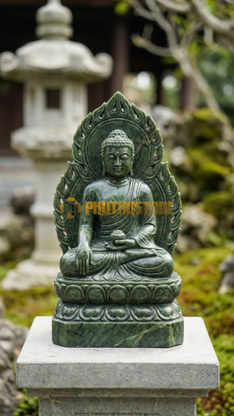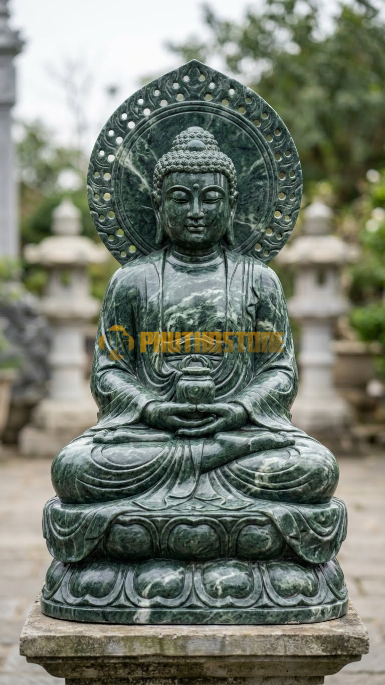 Nếu bạn yêu thích sự trầm mặc, cổ kính thì đá xanh Thanh Hóa là sự lựa chọn tuyệt vời. Loại đá này có đặc tính cực kỳ cứng và bền, chịu được mọi tác động khắc nghiệt của thời tiết. Tượng Dược Sư Hào Quang Lửa tạc từ đá xanh mang lại cảm giác uy nghiêm, vững chãi như một ngọn núi. Theo thời gian, đá xanh sẽ lên nước, tạo nên một lớp rêu phong tự nhiên rất đẹp cho các công trình tâm linh ngoài trời.