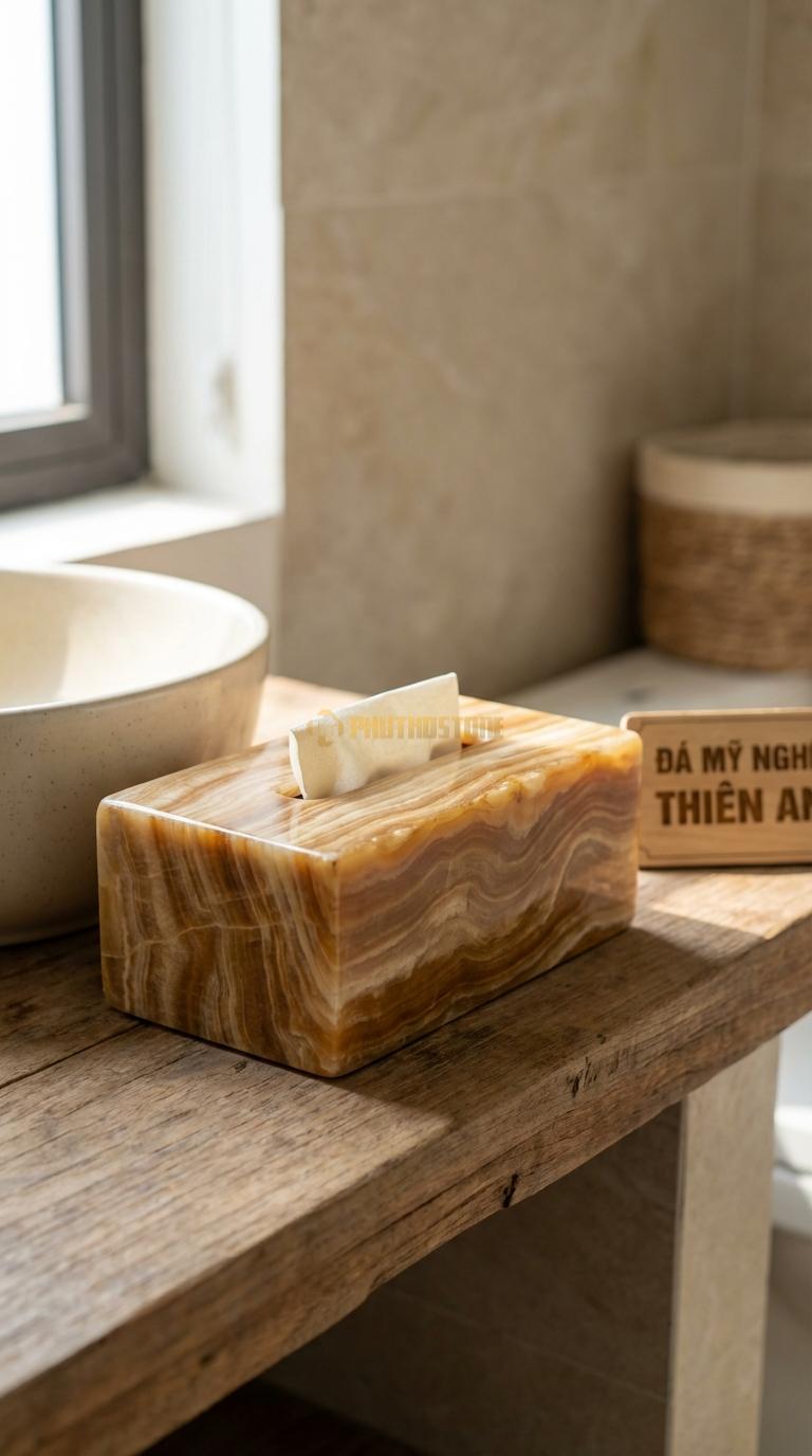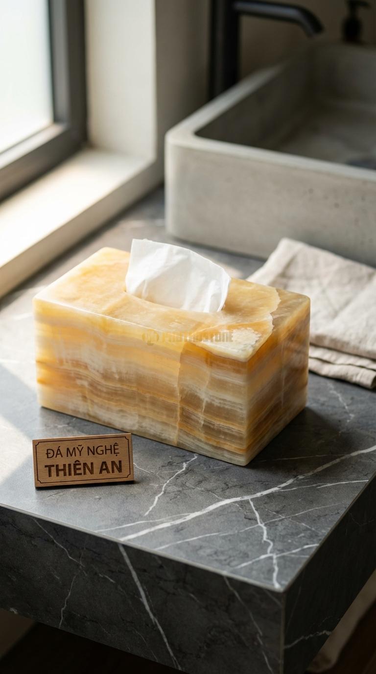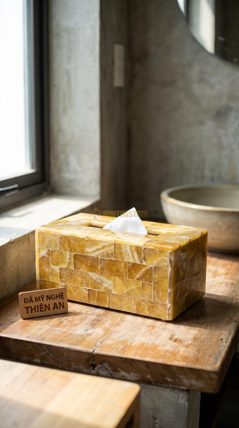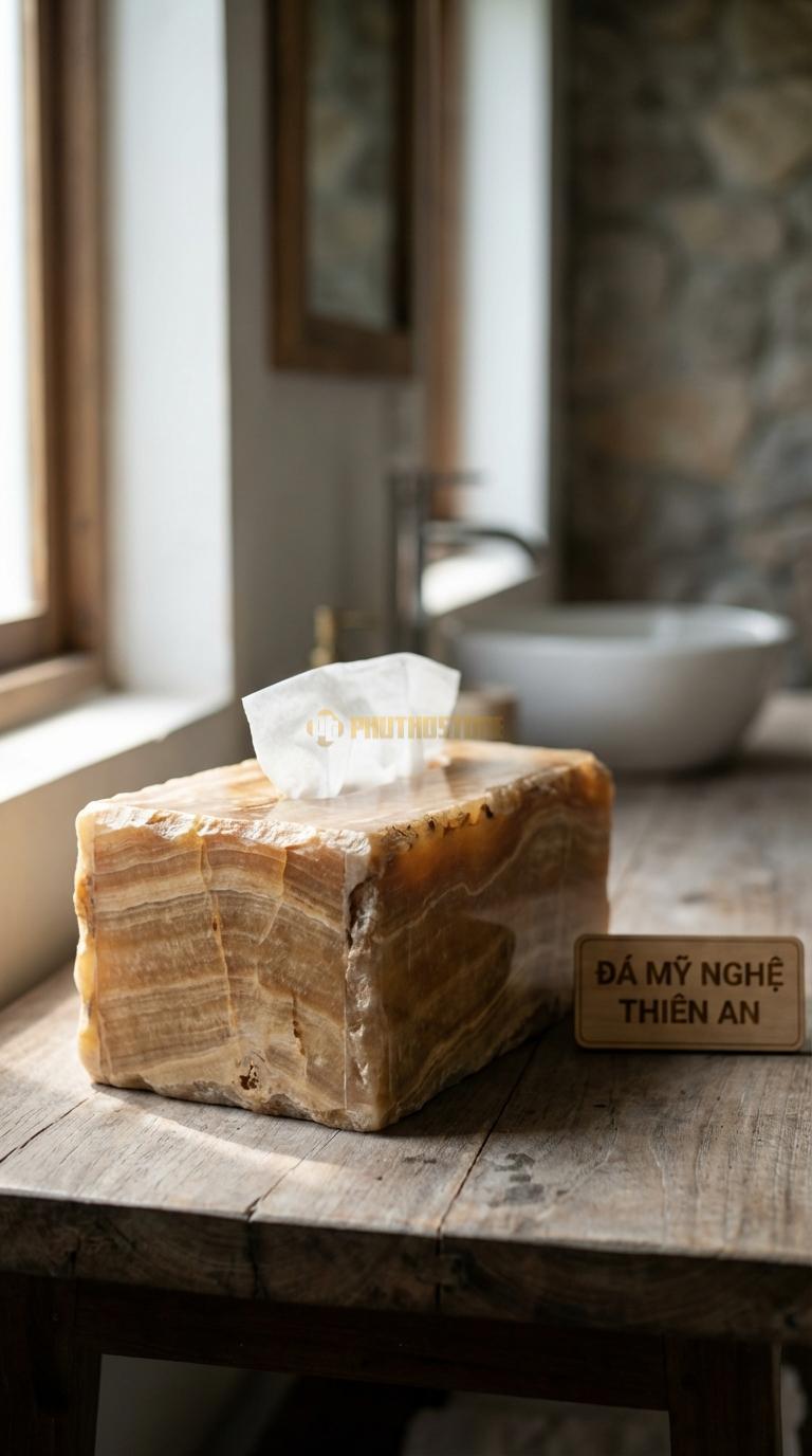 Hộp giấy đá tự nhiên có trọng lượng trung bình từ 1.5kg đến 3kg tùy kích thước. Độ nặng này thực tế là một ưu điểm lớn, giúp hộp đứng vững khi bạn rút giấy mà không cần dùng tay kia giữ lại như các loại hộp nhựa nhẹ. Về độ bền, đá tự nhiên rất cứng nhưng giòn, vì vậy nếu rơi từ độ cao lớn xuống sàn cứng thì có khả năng bị mẻ hoặc vỡ. Tôi luôn khuyên khách hàng nên đặt hộp ở vị trí cố định, chắc chắn để đảm bảo an toàn và vẻ đẹp lâu dài cho sản phẩm.