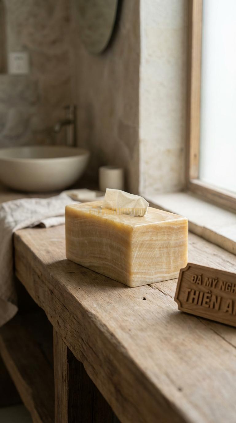 Xu hướng tối giản đang lên ngôi và đá tự nhiên là vật liệu không thể thiếu trong phong cách này. Những chiếc hộp giấy đá decor phong cách tối giản thường có hình khối vuông vức hoặc tròn trịa, bề mặt được mài nhẵn bóng hoặc mài mờ (honed) để tạo cảm giác mộc mạc. Tôi cực kỳ thích dòng này vì nó tôn vinh vẻ đẹp nguyên bản của đá. Không cần hoa văn cầu kỳ, chính những đường vân ngẫu hứng và màu sắc tự nhiên của đá đã là một bức tranh nghệ thuật hoàn hảo nhất. Những khách hàng trẻ tuổi, yêu thích sự tinh tế thường chọn mẫu này để trang trí cho căn hộ chung cư cao cấp của mình. Nó mang lại một cảm giác thanh bình, nhẹ nhàng giữa bộn bề cuộc sống.