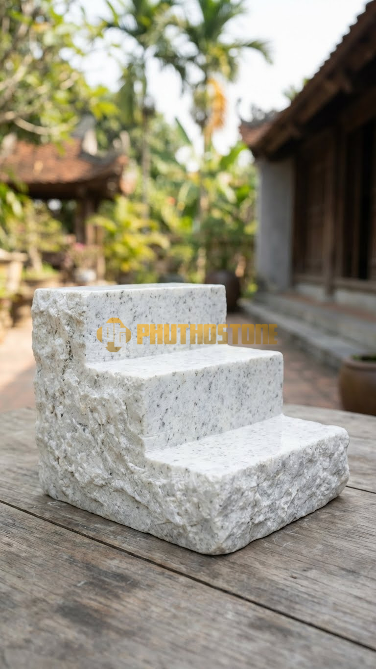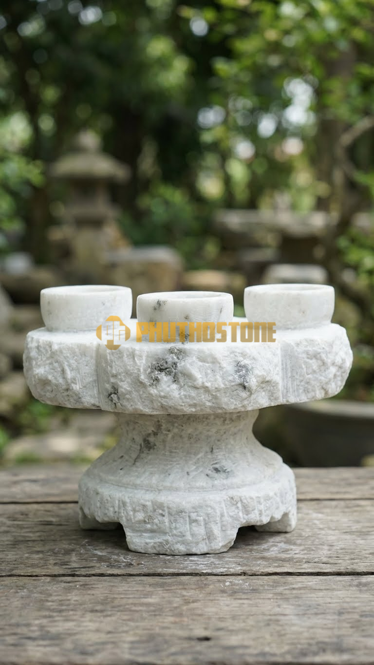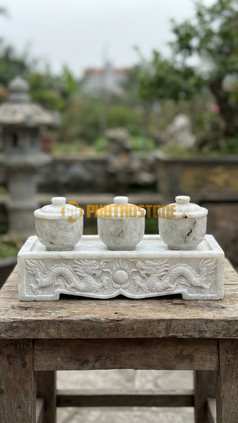 Nếu gia chủ yêu thích sự thanh khiết và tinh tế, đá trắng chính là lựa chọn số một. Đá trắng Nghệ An thường có màu trắng sữa hoặc trắng vân mây nhạt, tạo cảm giác nhẹ nhàng, thoát tục. Trong phong thủy, màu trắng thuộc hành Kim, rất tốt cho những người mệnh Thủy hoặc mệnh Kim. Bộ kỷ chén bằng đá trắng khi đặt trên bàn thờ gỗ nâu trầm sẽ tạo nên một điểm nhấn cực kỳ nổi bật và thanh lịch.