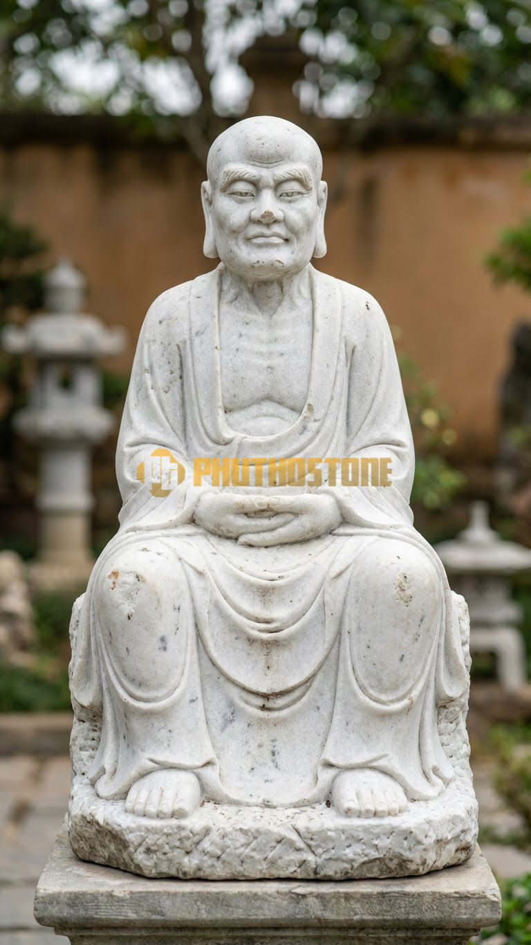 Hiện nay, chúng tôi chủ yếu sử dụng ba dòng đá chính để chế tác tượng La Hán Tọa Lộc. Đầu tiên là đá cẩm thạch trắng (Marble). Loại đá này mang lại vẻ đẹp thanh khiết, sang trọng và rất dễ làm nổi bật các chi tiết chạm khắc tinh xảo. Đây là lựa chọn hàng đầu cho các công trình chùa chiền hoặc biệt thự hiện đại. Khi ánh sáng chiếu vào, đá cẩm thạch trắng có độ thấu quang nhẹ, tạo nên một hào quang mờ ảo xung quanh tượng Phật, khiến không gian trở nên linh thiêng và huyền bí hơn rất nhiều.