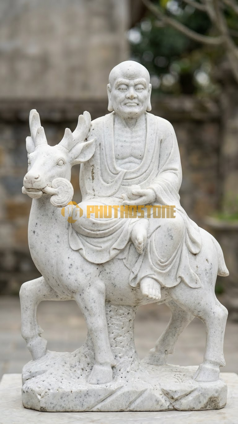 Đúng như cái tên "Tọa Lộc", hình ảnh con hươu chiếm một phần không nhỏ trong bố cục của bức tượng. Tại Phú Thọ Stone, chúng tôi chú trọng điêu khắc con hươu với vẻ ngoài khỏe khoắn nhưng hiền lành. Bộ sừng của hươu thường được tạc rất tỉ mỉ để thấy được sự cứng cáp, trong khi bộ lông được xử lý bằng những đường chạm mờ để tạo cảm giác mềm mại. Con hươu không chỉ là một con vật cưỡi, nó là người bạn đồng hành, là minh chứng cho sự cảm hóa của Phật pháp đối với chúng sinh.