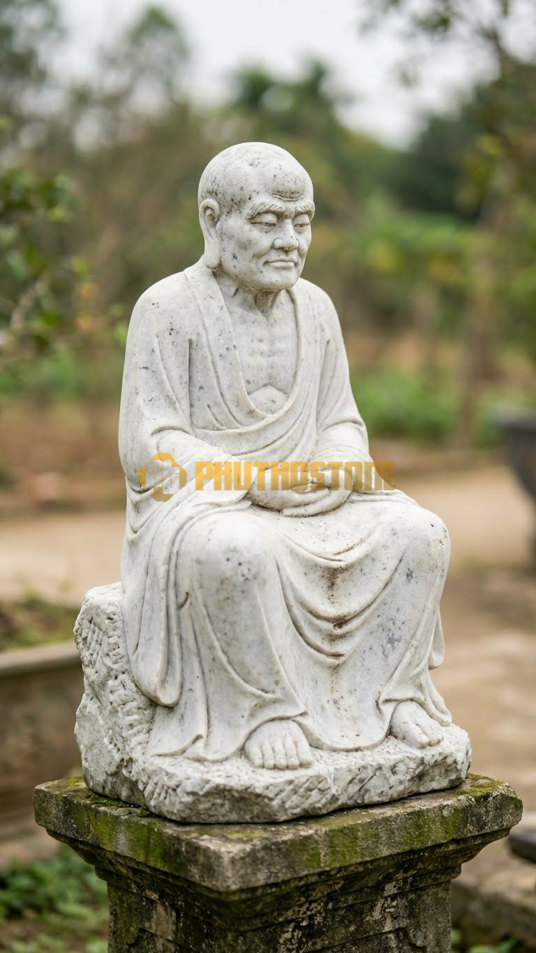Nếu bạn muốn đặt tượng trong không gian hiện đại hoặc trong nhà, đá trắng là một sự lựa chọn tuyệt vời. Màu trắng tượng trưng cho sự thuần khiết, thanh cao, rất phù hợp với hình ảnh của một bậc thánh nhân đã dứt bỏ bụi trần. Tuy nhiên, đá trắng đòi hỏi người thợ phải cực kỳ sạch sẽ và tỉ mỉ trong quá trình thi công vì chỉ một vết bẩn nhỏ cũng dễ dàng lộ ra.