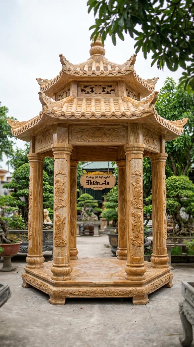 Hoàn toàn có thể, nhưng cần sự tinh chỉnh về kích thước. Với sân vườn nhỏ, tôi thường tư vấn mẫu lầu bát giác thu nhỏ với đường kính khoảng 2.5m - 3m. Việc sử dụng các cột đá thanh mảnh hơn và hoa văn nhẹ nhàng sẽ giúp không gian không bị nặng nề mà vẫn giữ được nét uy nghiêm, sang trọng vốn có của kiến trúc bát giác.