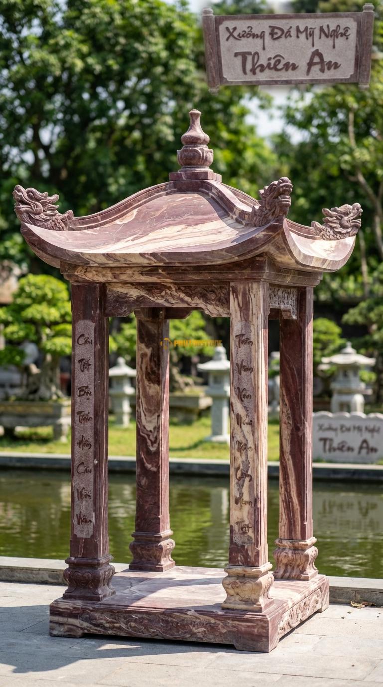 Vọng Lâu (Tứ giác) Đá Vân Gỗ Mái Đao Rồng: 4 góc mái cong vút hình đầu rồng, cột chạm câu đối. Vuông 3m00 x 3m00