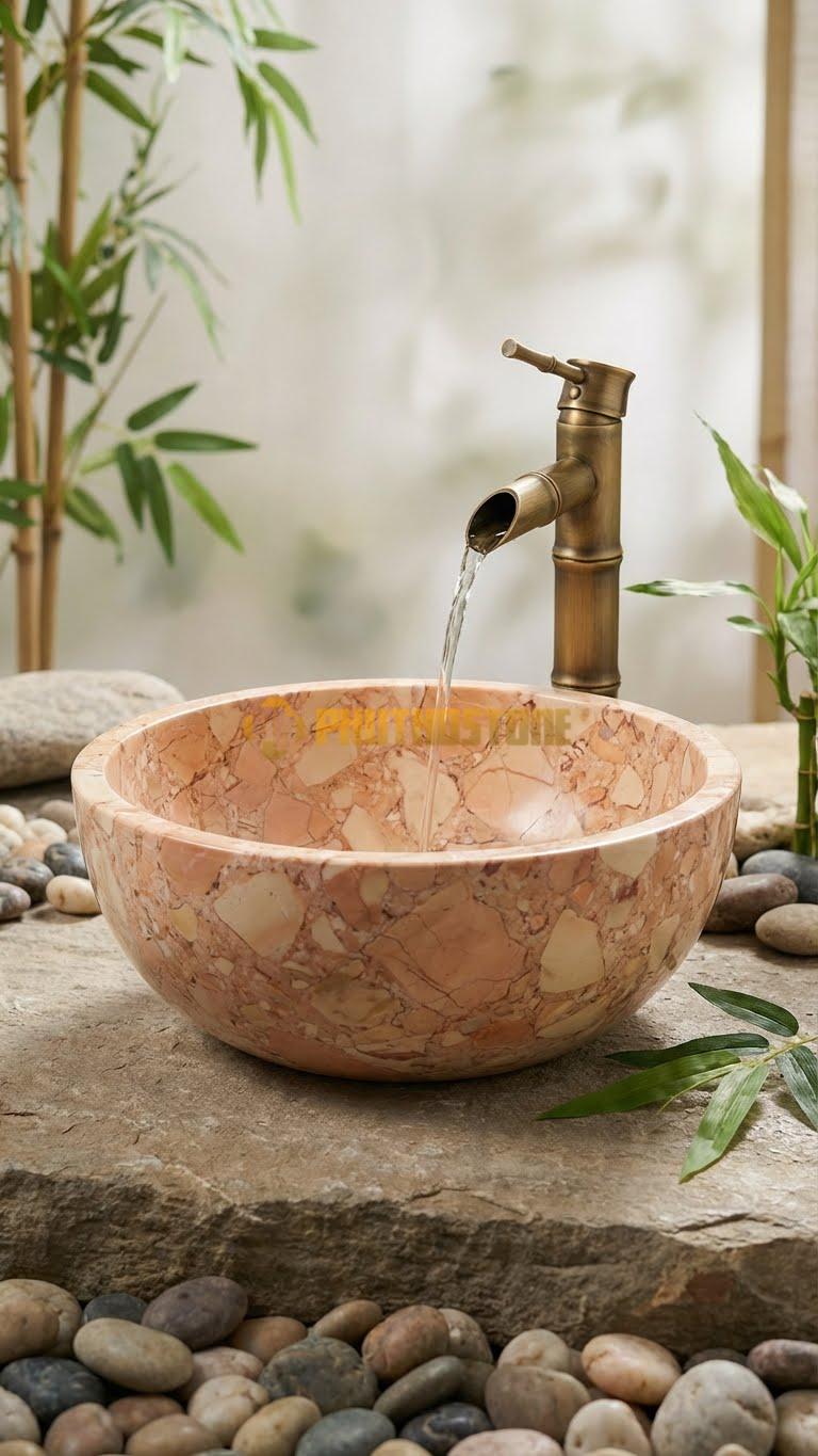Ngoài ra, hãy chú ý đến màu sắc của đá so với màu gạch ốp tường. Nếu tường màu tối, hãy chọn chậu đá màu sáng như trắng cẩm thạch hoặc vàng mật để tạo điểm nhấn nổi bật. Nếu không gian đi theo hướng trầm mặc, thiền định, những mẫu đá cuội sẫm màu sẽ mang lại sự tĩnh lặng và chiều sâu cần thiết. Sự hài hòa giữa kích thước, kiểu dáng và màu sắc sẽ biến phòng tắm của bạn thành một không gian thư giãn thực thụ sau những giờ làm việc căng thẳng.