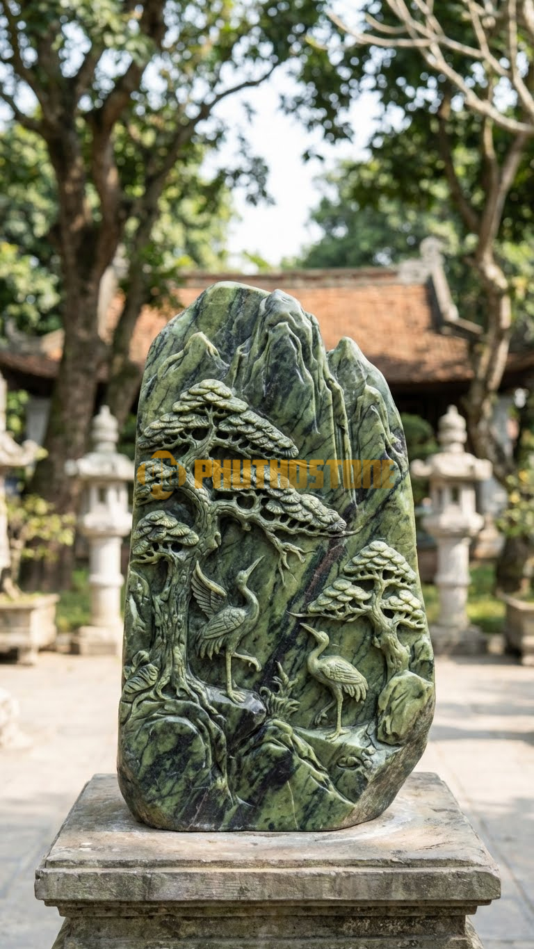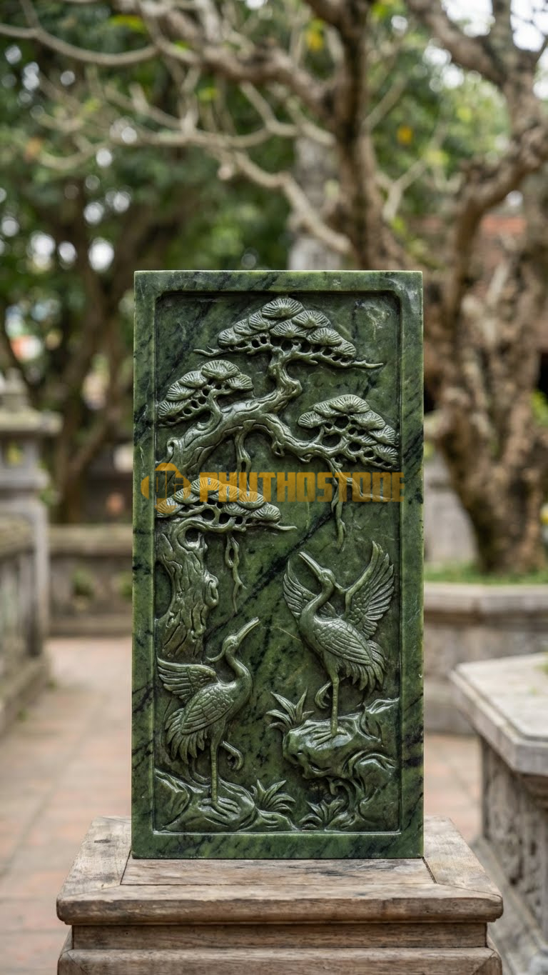 Phù Điêu Tùng Hạc Đá Serpentine xanh đậm, tạo chiều sâu hun hút