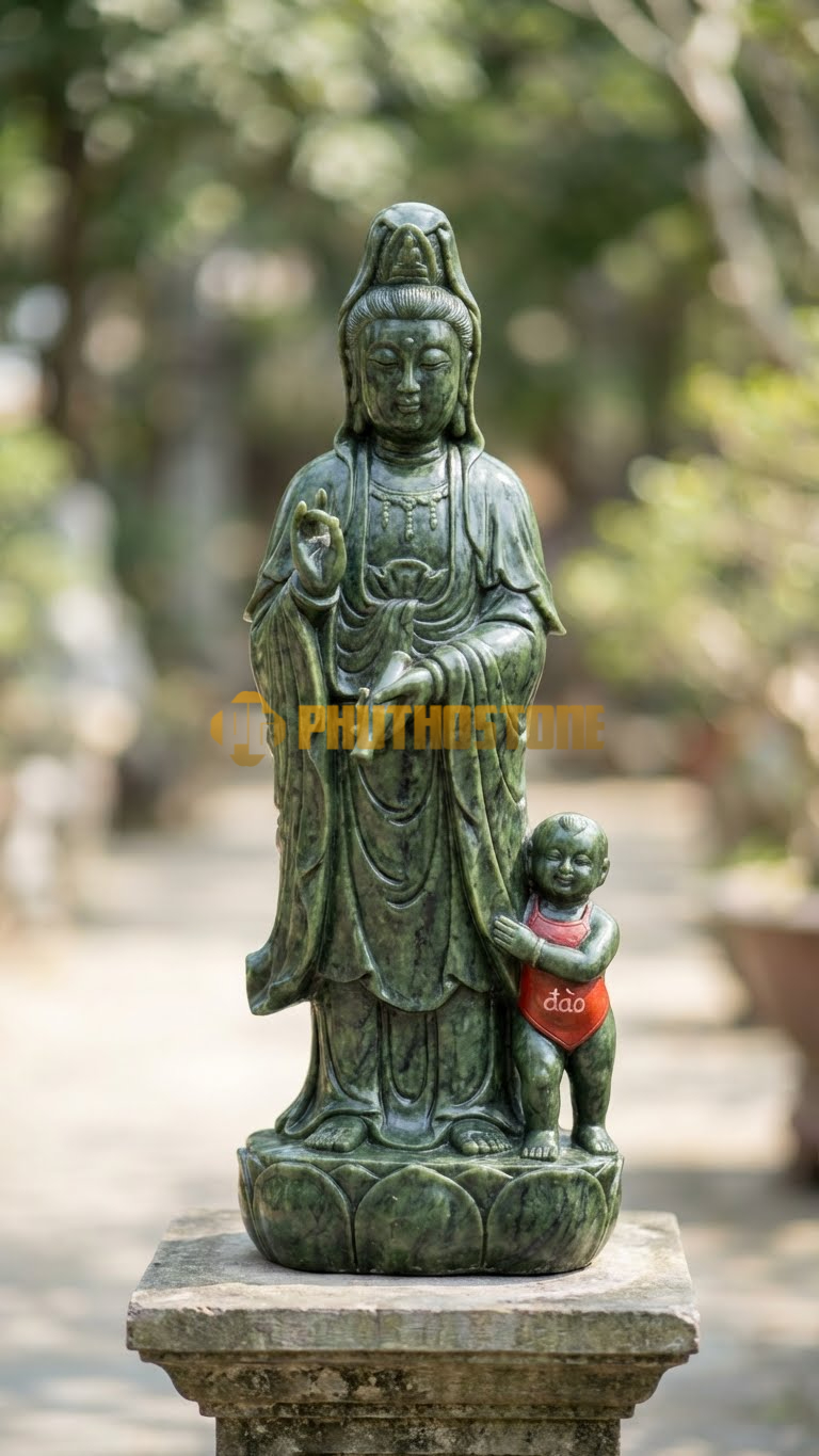 Hình ảnh Quan Thế Âm Bồ Tát bế một bé trai trên tay hoặc có cậu bé đứng dưới chân (thường gọi là Thiện Tài Đồng Tử) mang ý nghĩa phong thủy và tâm linh cực kỳ to lớn. Bé trai tượng trưng cho "Hậu duệ", là sự tiếp nối truyền thống và hưng thịnh của một gia tộc. Việc Ngài bế trẻ nhỏ khẳng định quyền năng ban phước lành và sự che chở tuyệt đối của Bồ Tát đối với những sinh linh nhỏ bé, yếu ớt. Đối với những người làm nghề đá như chúng tôi, việc tạc làm sao để toát lên được thần thái dịu hiền của Ngài và sự lanh lợi của đứa trẻ là một thử thách rất lớn về tay nghề.