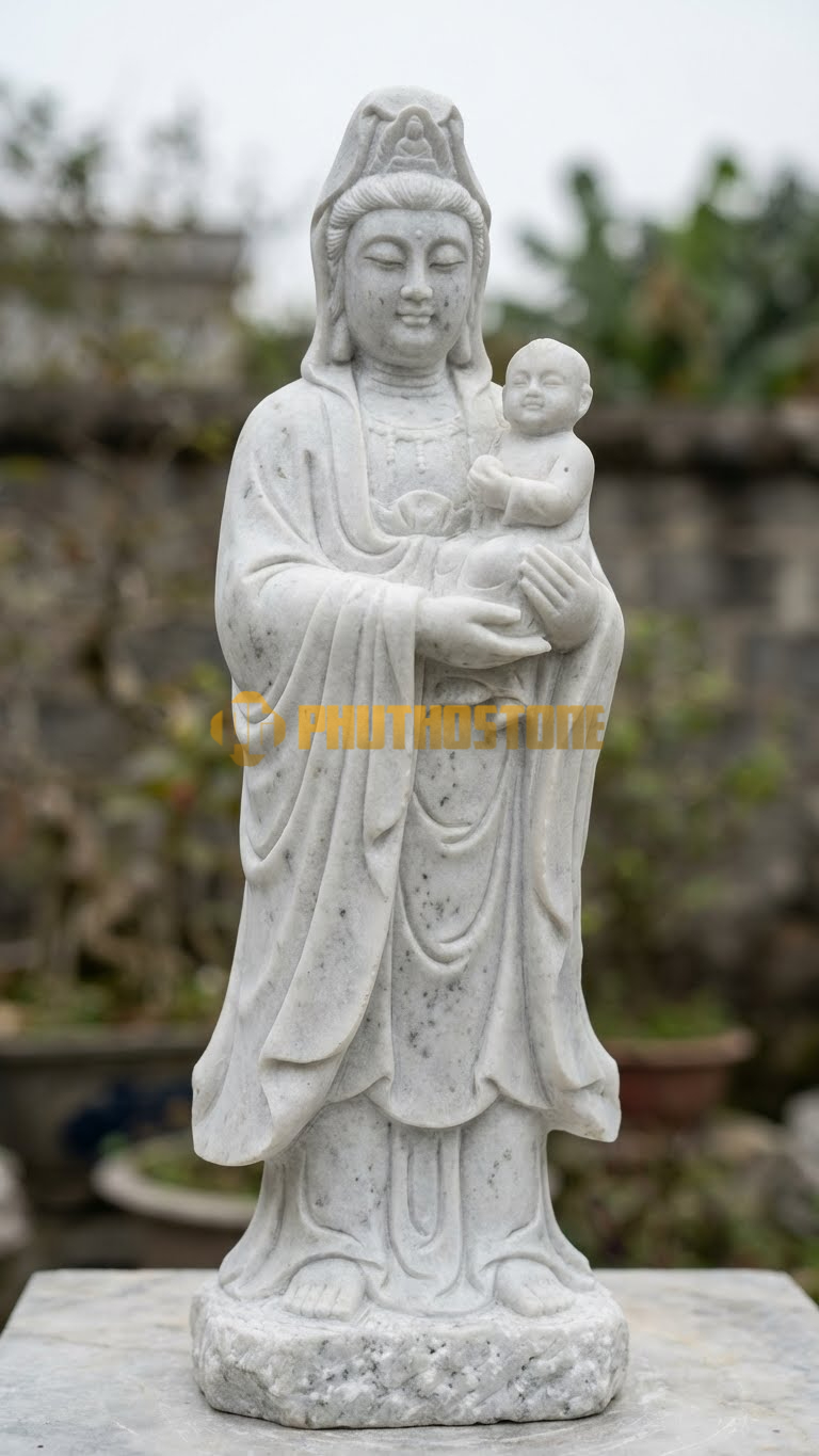 Nhiều khách hàng khi đến với Phú Thọ Stone thường nhầm lẫn giữa các hình tượng Quan Âm. Thực tế, mỗi hình tướng đều mang một đại nguyện riêng. Nếu như Bạch Y Quan Âm tượng trưng cho sự thanh tịnh, hóa giải tai ương, thì Quan Âm Tống Tử lại gắn liền với hình ảnh Ngài bế trên tay một đứa trẻ, hoặc có một đứa trẻ đứng cạnh gấu áo. Hình ảnh này toát lên vẻ hiền từ, bao dung như người mẹ hiền sẵn sàng trao đi mầm sống và tình yêu thương vô điều kiện. Đối với tôi, khi nhìn vào bức tượng này, cảm giác đầu tiên luôn là sự ấm áp, xóa tan đi cái lạnh lẽo của những khối đá thô sơ ban đầu.