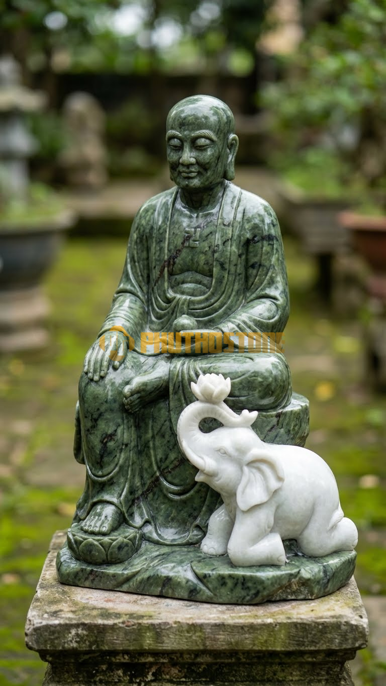 Tượng Phật Hoàng Trần Nhân Tông Đá Serpentine, voi trắng quỳ dâng hoa bên cạnh